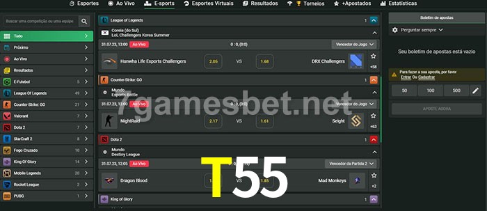 O T55 oferece uma grande seleção de opções de apostas em e-sports com probabilidades competitivas